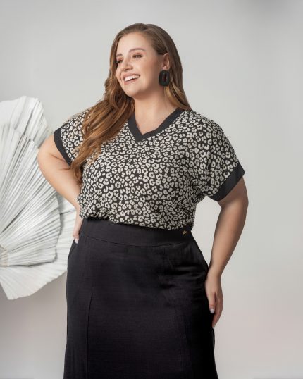 BLUSA EM VISCOSE COM FIVELA – SAIA MIDI ESTAMPADA