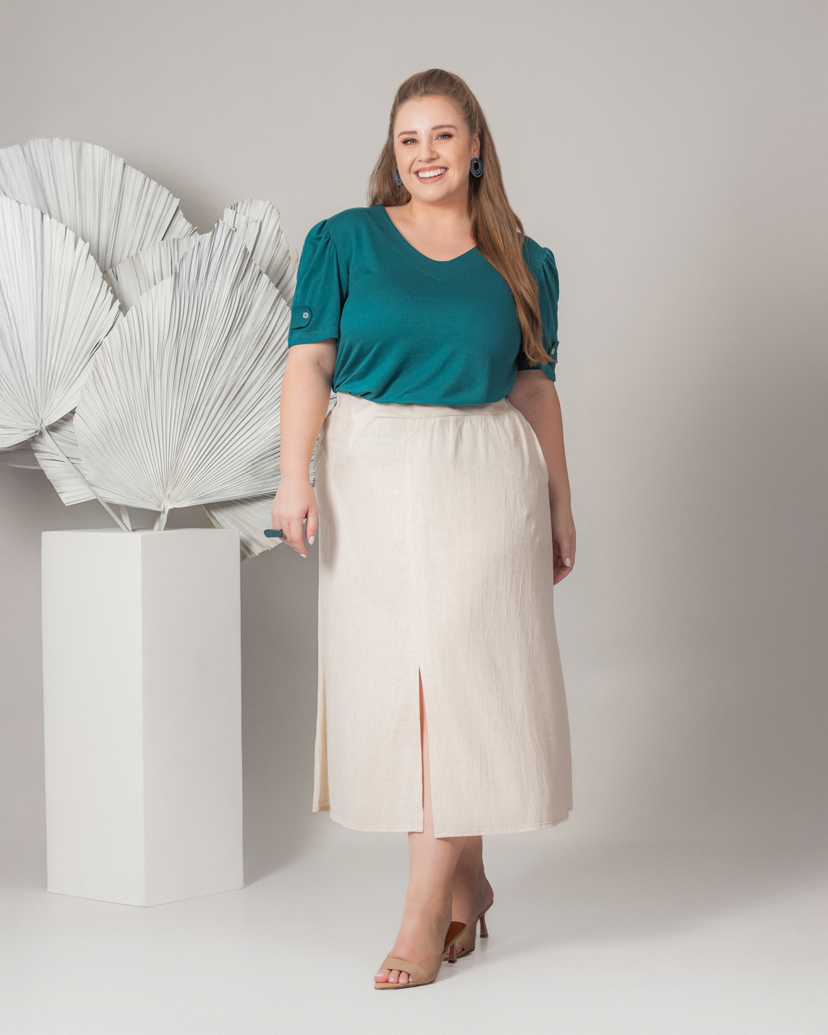BLUSA COM LAPELA NA MANGA – SAIA MIDI EM LINHO