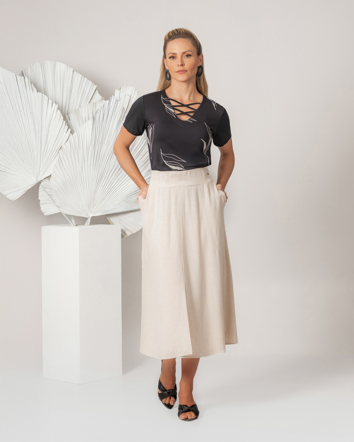 BLUSA COM TIRAS NO BUSTO – SAIA MIDI LINHO